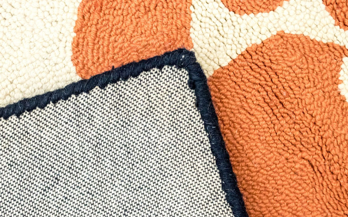 Dette tæppe er fremstillet udelukkende af håndspundet fåreuld. Manuel forarbejdning sikrer, at ulden bevarer sine naturlige egenskaber: den er slidstærk, elastisk og behageligt blød under fødderne.