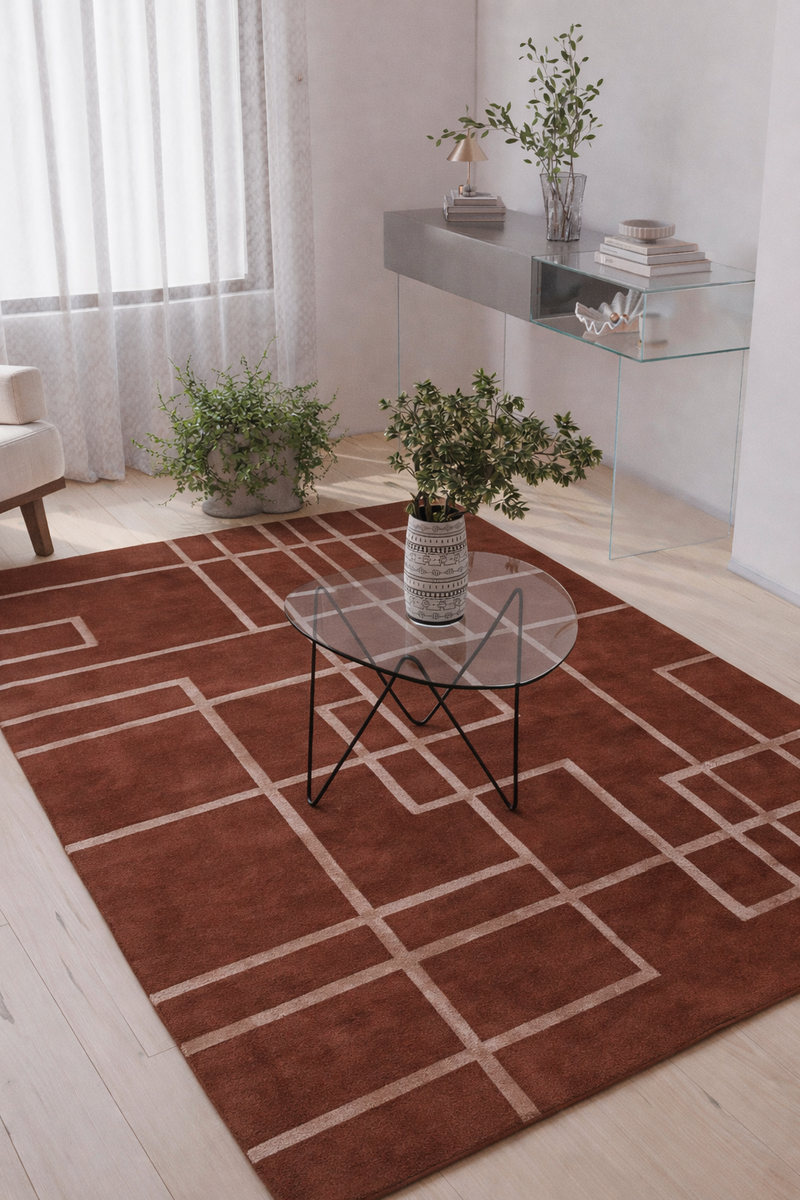 Sein modernes Design präsentiert sich in warmen Brauntönen, durchzogen von feinen, linear verlaufenden geometrischen Linien, die ein stilvoll verschachteltes Muster bilden. Diese ruhige, klare Linienführung wirkt strukturiert, zugleich aber harmonisch und leicht. Die präzise angewandte Handcarving-Technik hebt jede einzelne Linie fühlbar hervor und schafft eine raffinierte Hoch-Tief-Struktur, die dem Teppich eine beeindruckende dreidimensionale Wirkung verleiht.