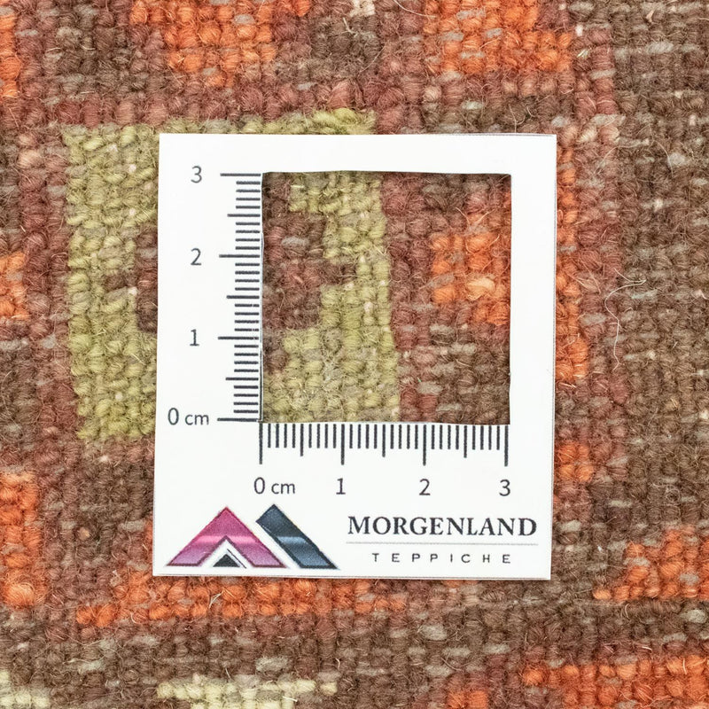 Dette tæppe er fremstillet udelukkende af håndspundet fåreuld. Manuel forarbejdning sikrer, at ulden bevarer sine naturlige egenskaber: den er slidstærk, elastisk og behageligt blød under fødderne.