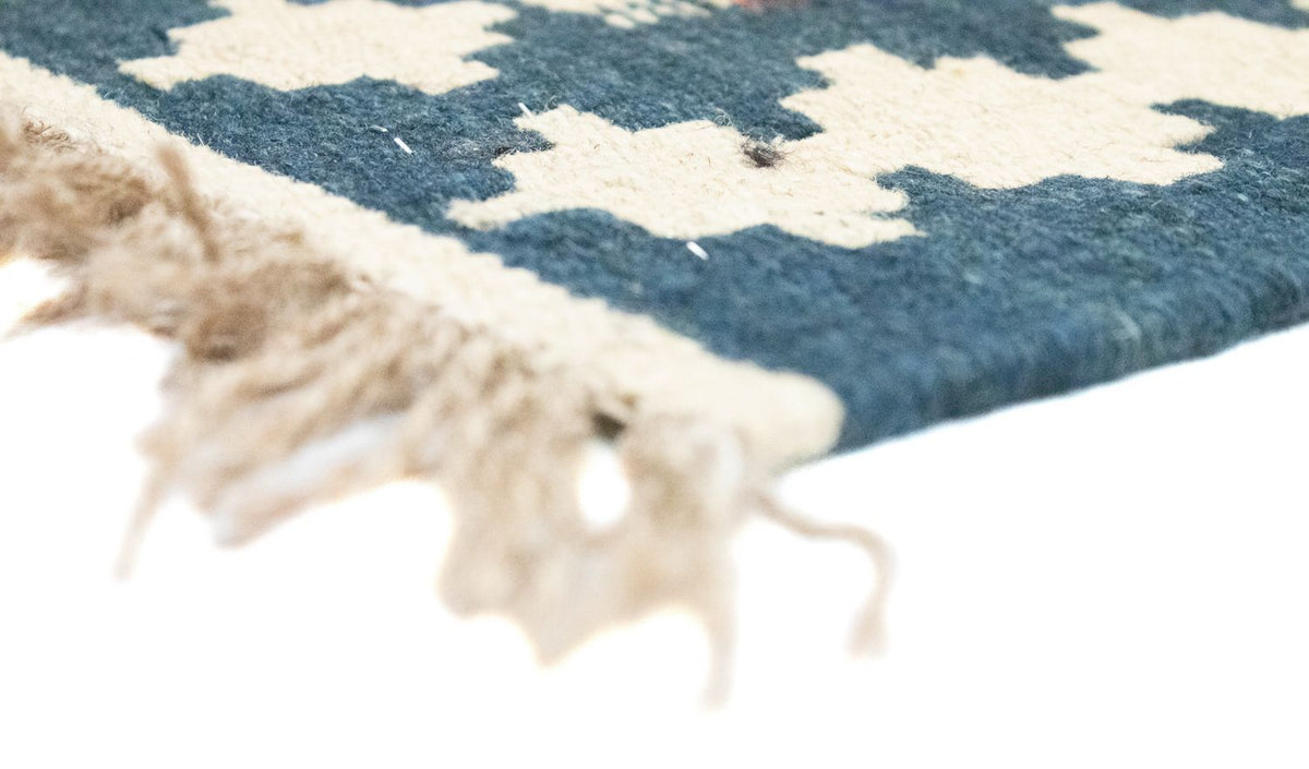 Dette tæppe er fremstillet udelukkende af håndspundet fåreuld. Manuel forarbejdning sikrer, at ulden bevarer sine naturlige egenskaber: den er slidstærk, elastisk og behageligt blød under fødderne.