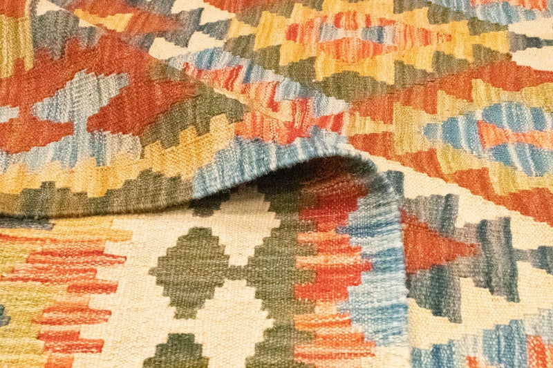 Denne kunstneriske Kelim - Oriental fanger øjet med sine trendy farver. Det giver en moderne og harmonisk elegance til din stue. I modsætning til klassiske orientalske tæpper er kelimtæpper traditionelt håndvævede i stedet for knyttede tæpper. I andre lande bruges disse tæpper også som puder eller gardiner. Disse tæpper har en tynd luv, og der anvendes 100 % jomfruuld til det faste yderstof, som i sagens natur er ekstremt let at passe og slidstærkt. Eksperter betegner kun tæpper, der er fremstillet i Tyrkiet, Kaukasusregionen, Persien, Afghanistan og Turkmenistan, som ægte kelim-tæpper. Ægte tæpper fra Orienten.