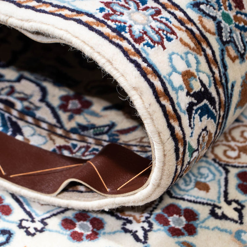 Denne fint håndknyttede Nain 9La vil passe perfekt ind i dit hjem. Den er fremstillet af korkuld og den fineste silke, hvilket gør den særlig blød under fødderne og skaber en luksuriøs atmosfære med sin glans. Det persiske tæppe - Nain - Royal hører til det høje kvalitetsniveau 3 med ca. 250.000 til 360.000 knuder pr. kvadratmeter. Det betyder, at den er meget tæt og dermed garanterer en lang levetid. Uanset hvilken indretningsstil du foretrækker i dit hjem, vil du altid træffe det rigtige valg med et Nain-tæppe.