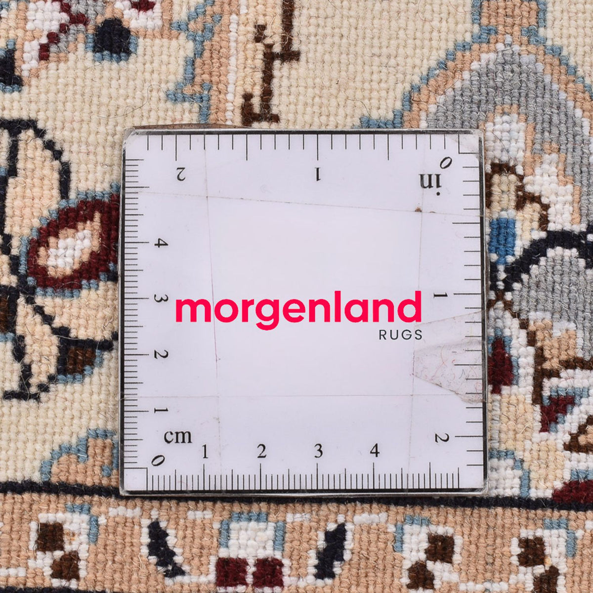 Denne fint håndknyttede Nain 9La vil passe perfekt ind i dit hjem. Den er fremstillet af korkuld og den fineste silke, hvilket gør den særlig blød under fødderne og skaber en luksuriøs atmosfære med sin glans. Det persiske tæppe - Nain - Royal hører til det høje kvalitetsniveau 3 med ca. 250.000 til 360.000 knuder pr. kvadratmeter. Det betyder, at den er meget tæt og dermed garanterer en lang levetid. Uanset hvilken indretningsstil du foretrækker i dit hjem, vil du altid træffe det rigtige valg med et Nain-tæppe.
