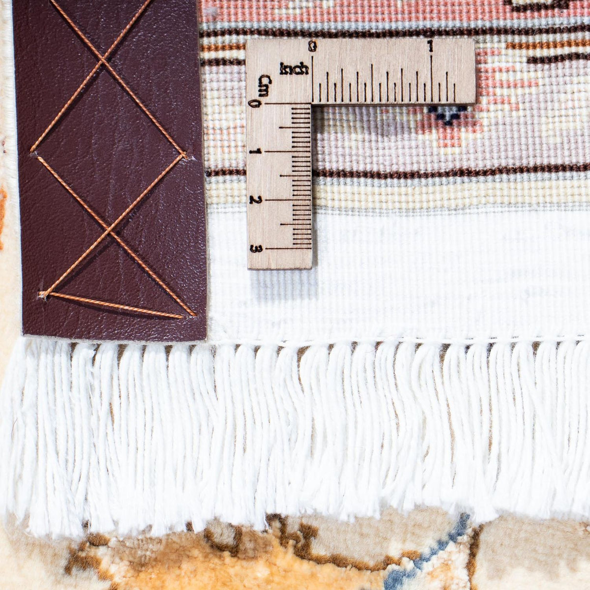 Dette fint knyttede persiske tæppe - Tabriz - Royal er lavet af korkuld af høj kvalitet i omhyggeligt og fejlfrit håndarbejde. Tabriz 40 Raj er en af de smukkeste i sin klasse. Dette tæppe skabte det gode ry for den persiske knyttekunst. Det er et meget populært tæppe fra et af de bedste knytteområder i Persien. De har ofte en stor, centralt placeret medaljon med smukke blomstermotiver, som er et typisk orientalsk motiv. Tabriz-tæpper har ofte den supplerende betegnelse Raj. Der skelnes mellem 40, 50, 60, 70 og 80 Raj. Jo højere tallet er, desto finere og tættere er tæppet knyttet. Raj er en kvalitetsbetegnelse og henviser til antallet af knuder på en bredde på ca. 70 mm. På grund af den tætte knudning er tæppet slidstærkt, ufølsomt og velegnet til ekstrem brug. Klassisk elegance og farveoverflod kendetegner dette ædle tæppe.