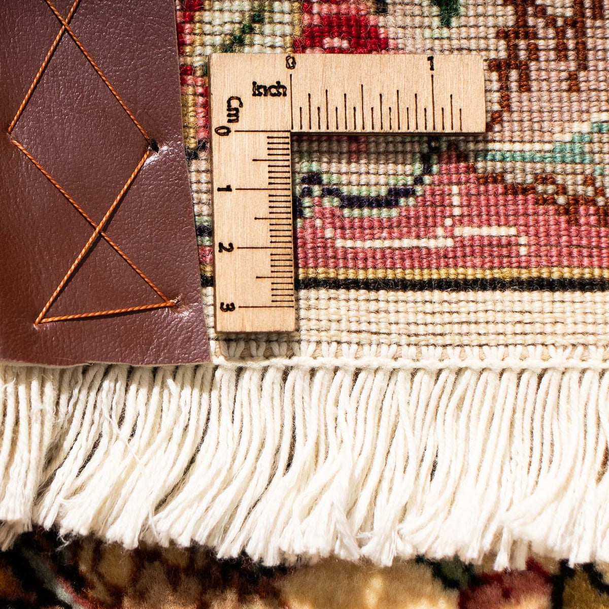 Dette fint knyttede persiske tæppe - Tabriz - Royal er lavet af korkuld af høj kvalitet i omhyggeligt og fejlfrit håndarbejde. Tabriz 40 Raj er en af de smukkeste i sin klasse. Dette tæppe skabte det gode ry for den persiske knyttekunst. Det er et meget populært tæppe fra et af de bedste knytteområder i Persien. De har ofte en stor, centralt placeret medaljon med smukke blomstermotiver, som er et typisk orientalsk motiv. Tabriz-tæpper har ofte den supplerende betegnelse Raj. Der skelnes mellem 40, 50, 60, 70 og 80 Raj. Jo højere tallet er, desto finere og tættere er tæppet knyttet. Raj er en kvalitetsbetegnelse og henviser til antallet af knuder på en bredde på ca. 70 mm. På grund af den tætte knudning er tæppet slidstærkt, ufølsomt og velegnet til ekstrem brug. Klassisk elegance og farveoverflod kendetegner dette ædle tæppe.