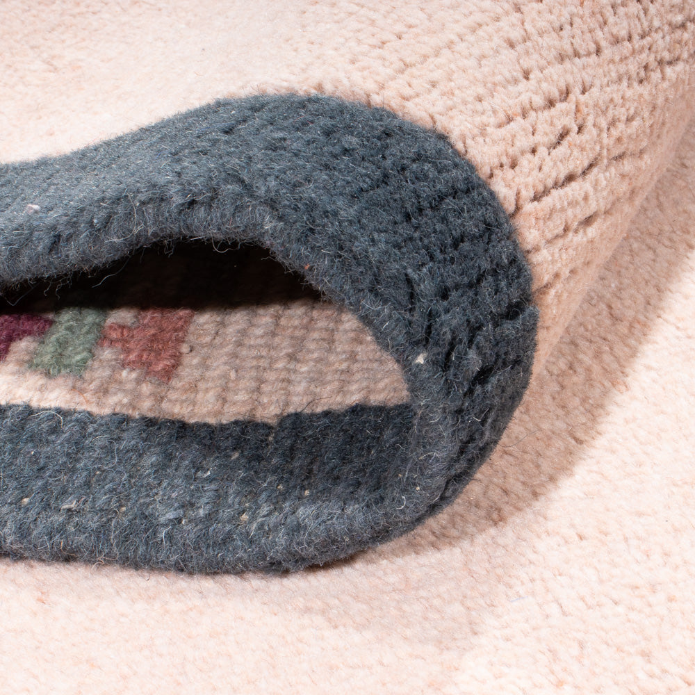 Dette tæppe er fremstillet udelukkende af håndspundet fåreuld. Manuel forarbejdning sikrer, at ulden bevarer sine naturlige egenskaber: den er slidstærk, elastisk og behageligt blød under fødderne.