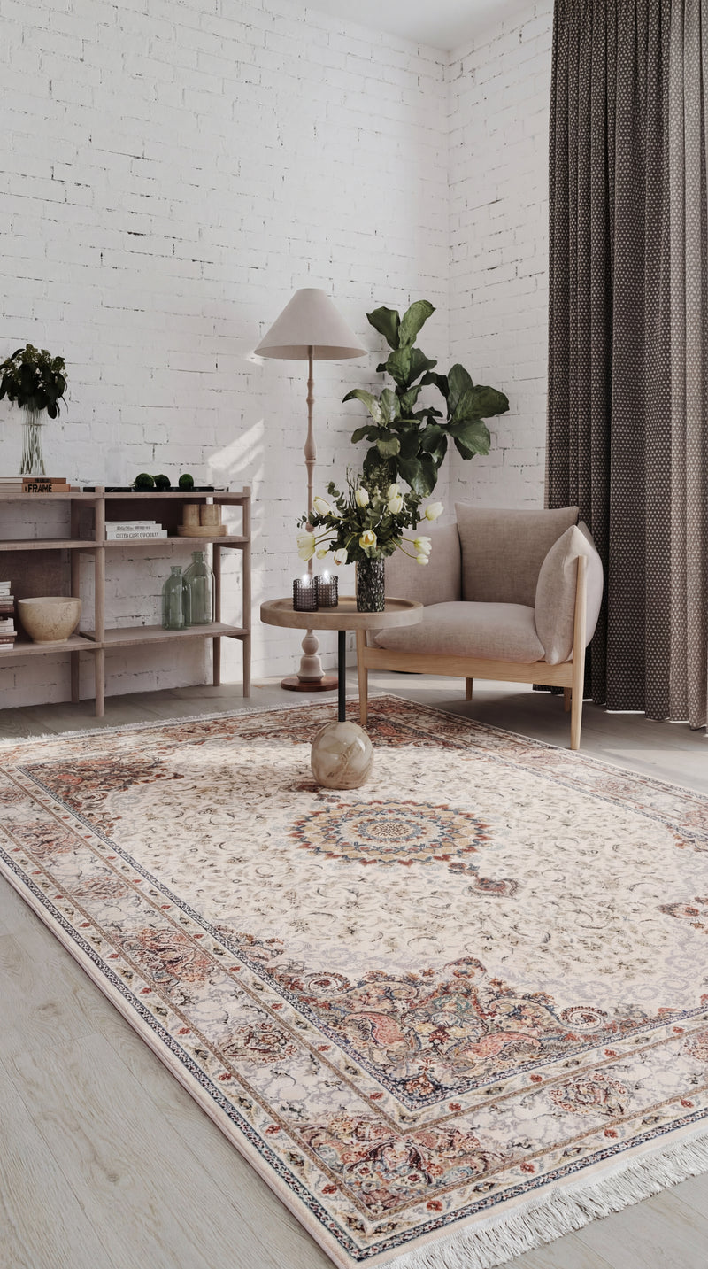 Oplev det orientalske tæppe "Baran" i en attraktiv cremefarve, der fås som rektangulært tæppe og løber. Dette tæppe imponerer med sit klassiske design, som giver ethvert rum en elegant atmosfære. Udførelsen i høj kvalitet sikrer holdbarhed og lang levetid. Takket være de lette plejeegenskaber ser "Baran"-tæppet altid godt ud. Tæppet er perfekt til stuen, soveværelset eller gangen. Det bringer hygge og stil ind i dit hjem.