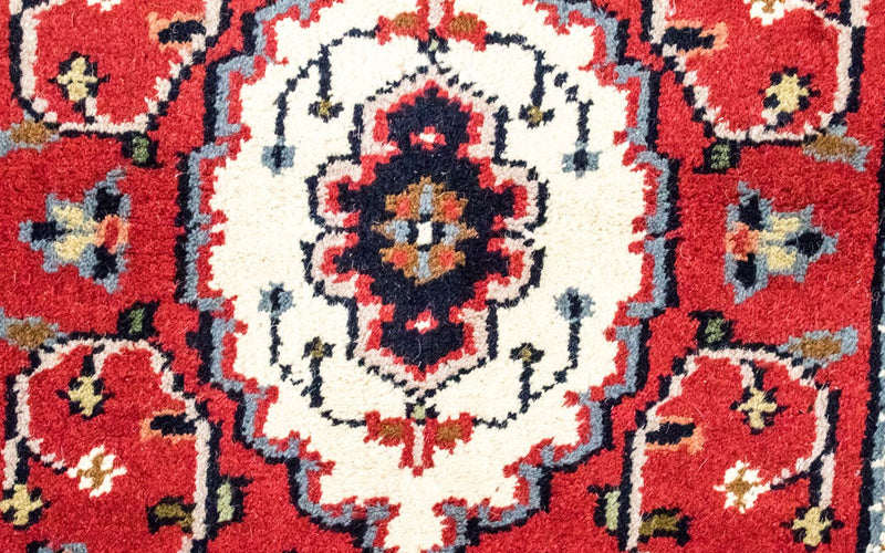 Oplev det smukke håndknyttede orientalske tæppe "Shams" lavet af 100% ren uld i en intens rød farve. Dette rektangulære tæppe kombinerer traditionelt håndværk med tidløs elegance og bringer en luksuriøs atmosfære ind i dit hjem. De fine, detaljerede mønstre og den høje kvalitet gør dette tæppe til et ægte højdepunkt i ethvert rum. Perfekt til elskere af klassisk tæppekunst og langtidsholdbar kvalitet.