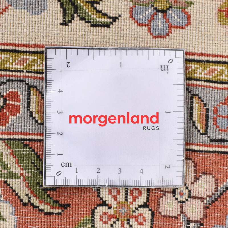 Dette smukke og stilfuldt mønstrede persiske tæppe - Ghom - Royal er også kendt som Ilnam-tæppe. Det hører til det høje kvalitetsniveau 3 og er meget fint fremstillet med 422.500 til 490.000 knuder pr. kvadratmeter. Ilnam-vævningerne er stadig relativt nye. De er kunstfærdigt håndknyttede og slidstærke. Et Ilnam-tæppe bringer friskhed ind i dit hjem og kan kombineres perfekt med mange indretningsstile.