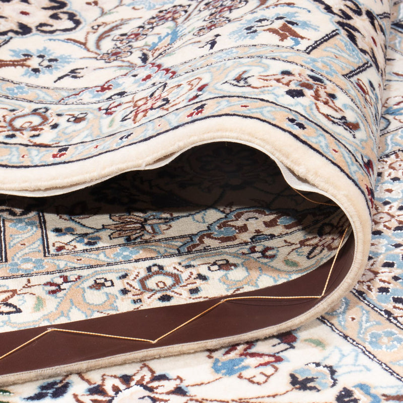 Dette smukke og sjældent fint vævede persiske tæppe - Nain - Premium hører til det højeste kvalitetsniveau 4 med ca. 890.000 til 1.000.000 knuder pr. kvadratmeter. Den fine Nain 6La har sin berømmelse at takke for sin oprindelse. Det anses i hele Orienten for at være et persisk tæppe af særlig høj kvalitet. Nain-tæpper er knyttede med en enestående finhed. Som bunmateriale anvendes normalt den bedste, fløjlsagtige korkuld, og der anvendes altid silke, så der kan laves et nøjagtigt mønster af medaljoner og all-over-mønstre. Nain er opdelt i 4 kvalitetsniveauer, som er angivet med "La". 4La, 6La, 9La, 12La. Dette er en kvalitetsbetegnelse og henviser til antallet af trådlag i hver kædetråd. Jo lavere det angivne tal er, jo finere og tættere er tæppet. Nains er blandt de smukkeste i verden. De er meget populære blandt samlere. På grund af deres enkle elegance passer Nains også ind i moderne interiør.