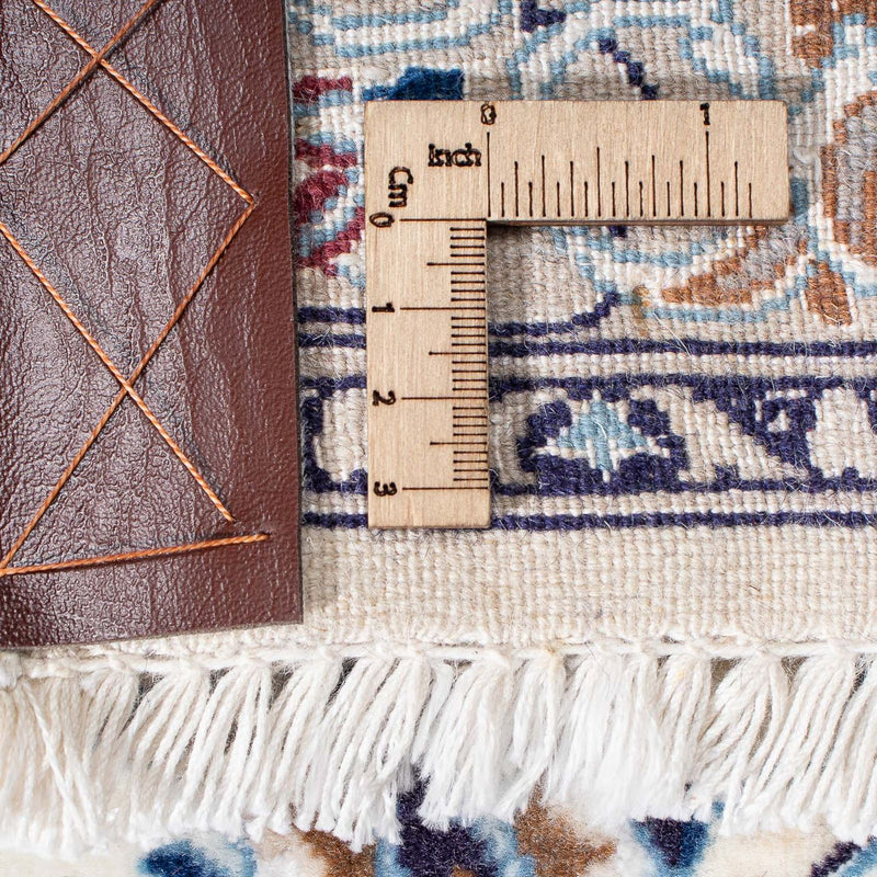 Dette smukke og sjældent fint vævede persiske tæppe - Nain - Premium hører til det højeste kvalitetsniveau 4 med ca. 890.000 til 1.000.000 knuder pr. kvadratmeter. Den fine Nain 6La har sin berømmelse at takke for sin oprindelse. Det anses i hele Orienten for at være et persisk tæppe af særlig høj kvalitet. Nain-tæpper er knyttede med en enestående finhed. Som bunmateriale anvendes normalt den bedste, fløjlsagtige korkuld, og der anvendes altid silke, så der kan laves et nøjagtigt mønster af medaljoner og all-over-mønstre. Nain er opdelt i 4 kvalitetsniveauer, som er angivet med "La". 4La, 6La, 9La, 12La. Dette er en kvalitetsbetegnelse og henviser til antallet af trådlag i hver kædetråd. Jo lavere det angivne tal er, jo finere og tættere er tæppet. Nains er blandt de smukkeste i verden. De er meget populære blandt samlere. På grund af deres enkle elegance passer Nains også ind i moderne interiør.