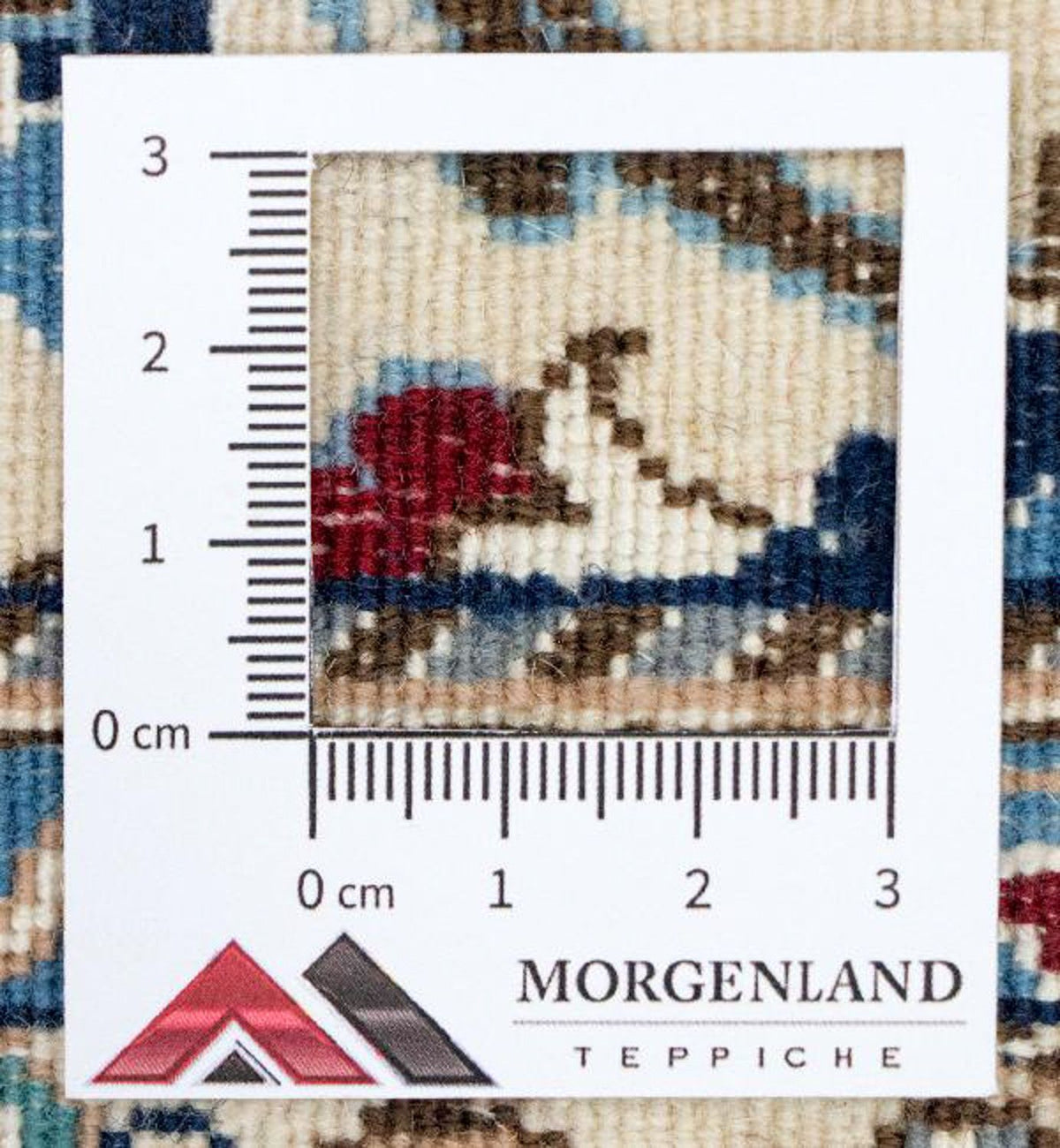 Dette smukke og sjældent fint vævede persiske tæppe - Nain - Premium hører til det højeste kvalitetsniveau 4 med ca. 890.000 til 1.000.000 knuder pr. kvadratmeter. Den fine Nain 6La har sin berømmelse at takke for sin oprindelse. Det anses i hele Orienten for at være et persisk tæppe af særlig høj kvalitet. Nain-tæpper er knyttede med en enestående finhed. Som bunmateriale anvendes normalt den bedste, fløjlsagtige korkuld, og der anvendes altid silke, så der kan laves et nøjagtigt mønster af medaljoner og all-over-mønstre. Nain er opdelt i 4 kvalitetsniveauer, som er angivet med "La". 4La, 6La, 9La, 12La. Dette er en kvalitetsbetegnelse og henviser til antallet af trådlag i hver kædetråd. Jo lavere det angivne tal er, jo finere og tættere er tæppet. Nains er blandt de smukkeste i verden. De er meget populære blandt samlere. På grund af deres enkle elegance passer Nains også ind i moderne interiør.