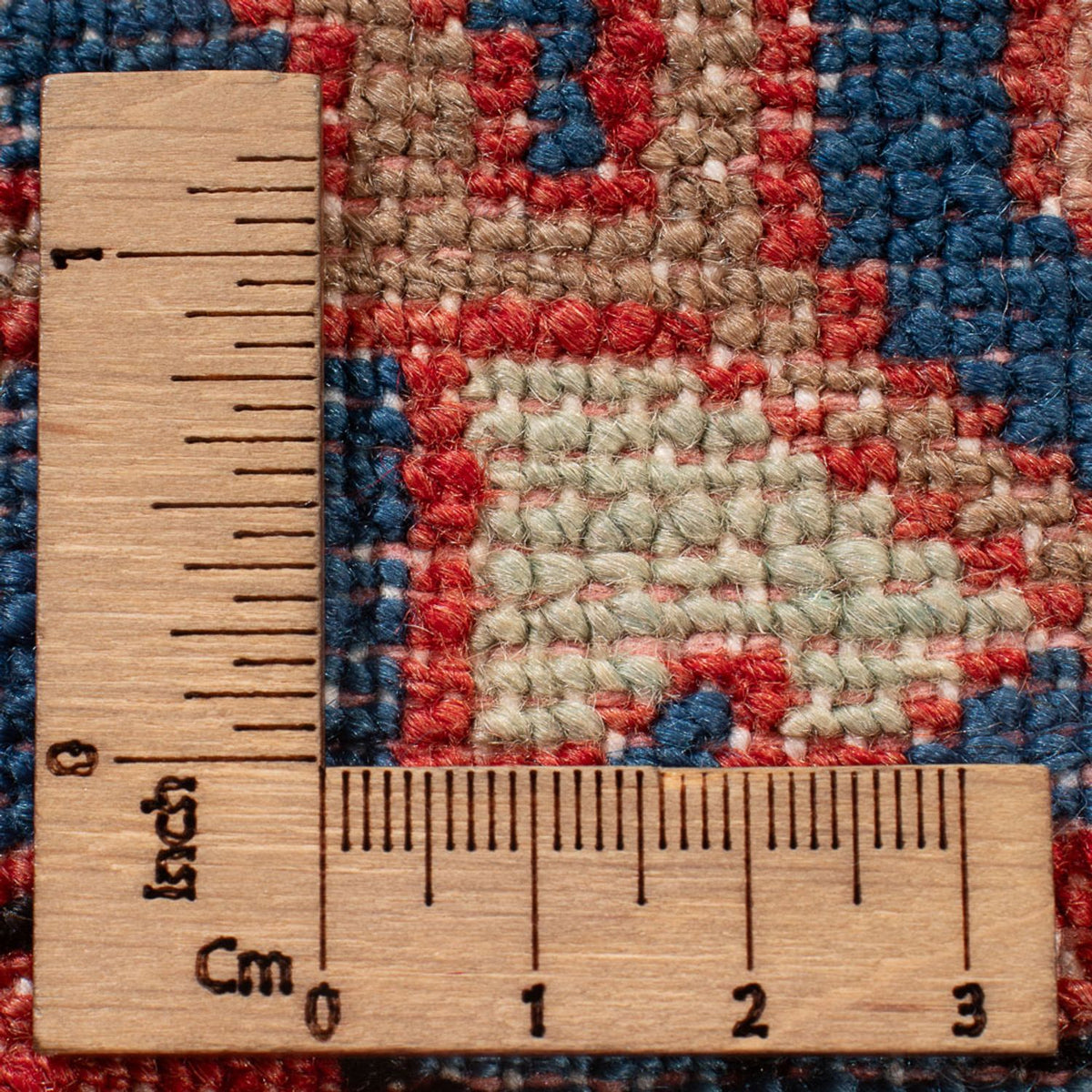 Dette Nahavand-tæppe er lavet af den bedste kvalitet. Rustik charme, varme naturfarver i indigo blå og rød og særlig holdbarhed er kendetegnende for Nahavand-tæppet. Håndspundet iransk højlandsuld fra Iran giver det en blød glans. Den "tyrkiske knude" giver den robuste overflade. Nahavand anses for at være et af de enkleste persiske tæpper. De er traditionelt håndknyttet i landsbyerne omkring den iranske by Hamedan. Hvert tæppe er et fantasifuldt individuelt stykke. Små uregelmæssigheder i mønstret viser dette. Nahavands er smukke brugstæpper med et attraktivt pris/ydelsesforhold.