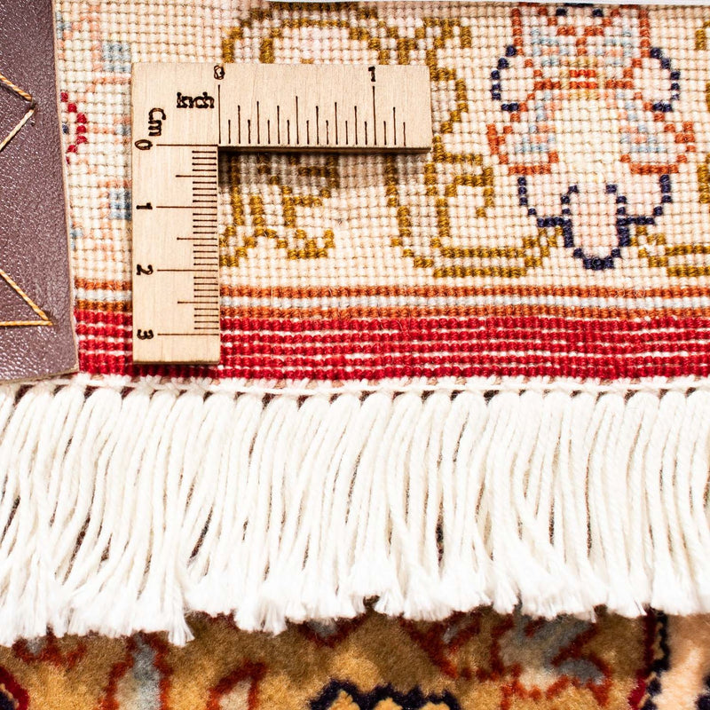 Dette fint knyttede persiske tæppe - Tabriz - Royal er lavet af korkuld af høj kvalitet i omhyggeligt og fejlfrit håndarbejde. Tabriz 40 Raj er en af de smukkeste i sin klasse. Dette tæppe skabte det gode ry for den persiske knyttekunst. Det er et meget populært tæppe fra et af de bedste knytteområder i Persien. De har ofte en stor, centralt placeret medaljon med smukke blomstermotiver, som er et typisk orientalsk motiv. Tabriz-tæpper har ofte den supplerende betegnelse Raj. Der skelnes mellem 40, 50, 60, 70 og 80 Raj. Jo højere tallet er, desto finere og tættere er tæppet knyttet. Raj er en kvalitetsbetegnelse og henviser til antallet af knuder på en bredde på ca. 70 mm. På grund af den tætte knudning er tæppet slidstærkt, ufølsomt og velegnet til ekstrem brug. Klassisk elegance og farveoverflod kendetegner dette ædle tæppe.