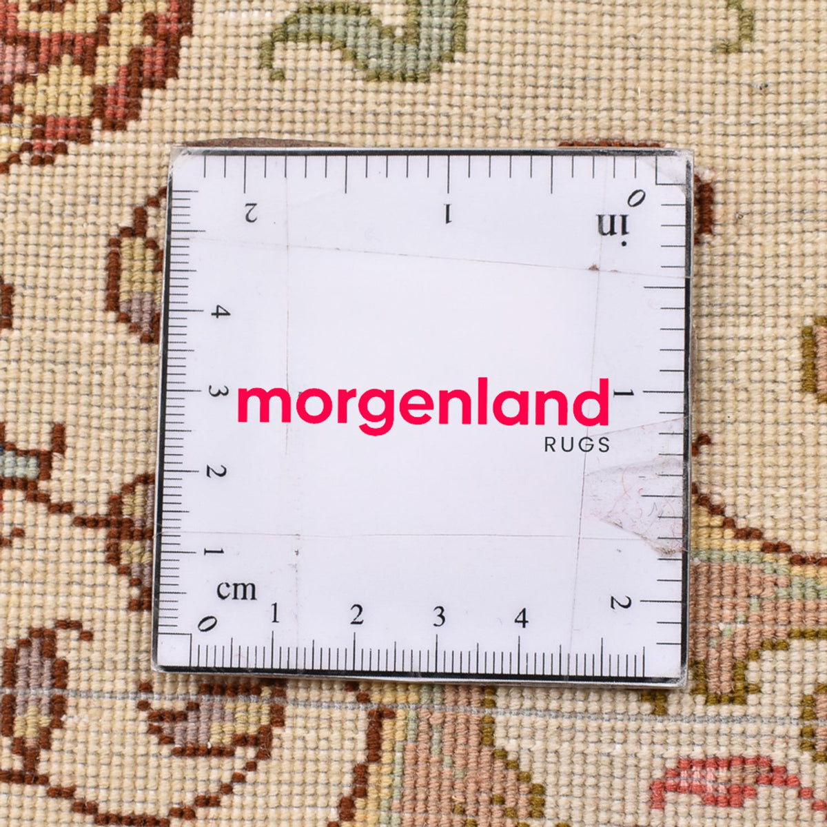Dette fint knyttede persiske tæppe - Tabriz - Royal er lavet af korkuld af høj kvalitet i omhyggeligt og fejlfrit håndarbejde. Tabriz 40 Raj er en af de smukkeste i sin klasse. Dette tæppe skabte det gode ry for den persiske knyttekunst. Det er et meget populært tæppe fra et af de bedste knytteområder i Persien. De har ofte en stor, centralt placeret medaljon med smukke blomstermotiver, som er et typisk orientalsk motiv. Tabriz-tæpper har ofte den supplerende betegnelse Raj. Der skelnes mellem 40, 50, 60, 70 og 80 Raj. Jo højere tallet er, desto finere og tættere er tæppet knyttet. Raj er en kvalitetsbetegnelse og henviser til antallet af knuder på en bredde på ca. 70 mm. På grund af den tætte knudning er tæppet slidstærkt, ufølsomt og velegnet til ekstrem brug. Klassisk elegance og farveoverflod kendetegner dette ædle tæppe.