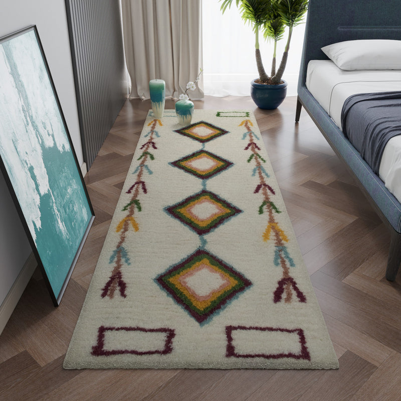 Det håndlavede Bedouin Bliss-tæppe fra Morgenland FUTURA imponerer med sin mangfoldige farvepalet og geometriske mønstre, som giver det et moderne og levende look. Det er fremstillet af ny uld af høj kvalitet og er blødt at røre ved og holdbart. Tæppet giver en stærk accent til enhver bolig og passer perfekt til moderne, klassisk og boho-interiør.