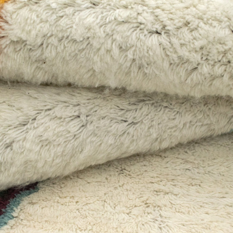 Dette tæppe er fremstillet udelukkende af håndspundet fåreuld. Manuel forarbejdning sikrer, at ulden bevarer sine naturlige egenskaber: den er slidstærk, elastisk og behageligt blød under fødderne.